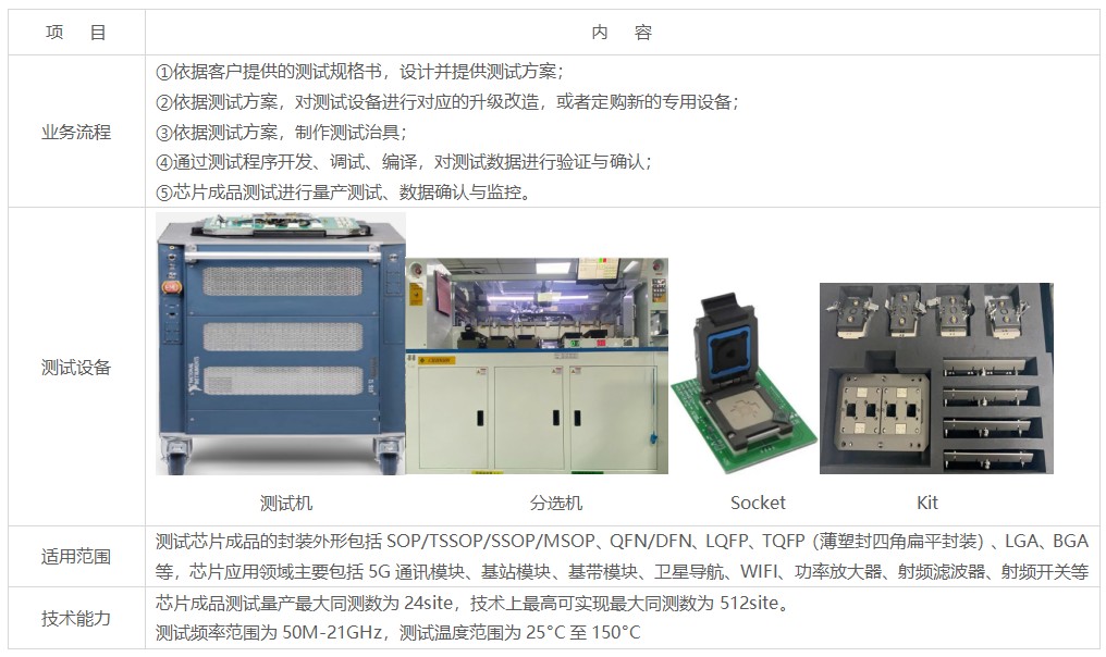 ? ? ? ? 測試芯片成品的封裝外形包括SOP/TSSOP/SSOP/MSOP、QFN/DFN、LQFP、TQFP(薄塑封四角扁平封裝)、LGA、BGA等,芯片應(yīng)用領(lǐng)域主要包括5G通訊模塊、基站模塊、基帶模塊、衛(wèi)星導(dǎo)航、WIFI、功率放大器、射頻濾波器、射頻開關(guān)等。